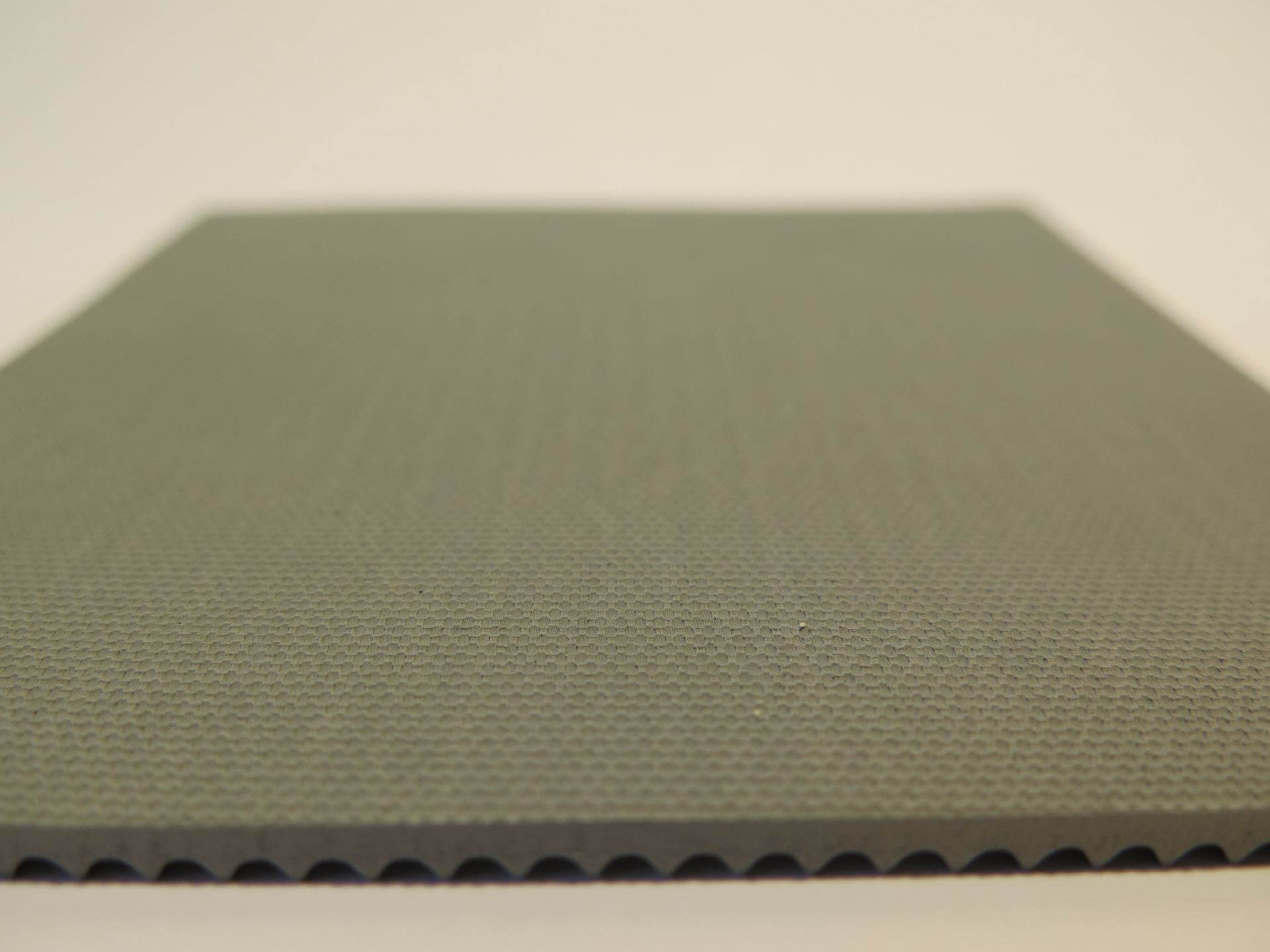 Unterseite: Feine Mikrostruktur, ähnlich eines Leinenstoffs. Dieses Muster verbessert die Haftung und erleichtert eine gegebenenfalls gewünschte Verklebung. Durch die spezielle Struktur kann der Kleber eine bessere Verbindung mit dem Gummi eingehen. Die Verklebung wird dadurch deutlich vereinfacht.