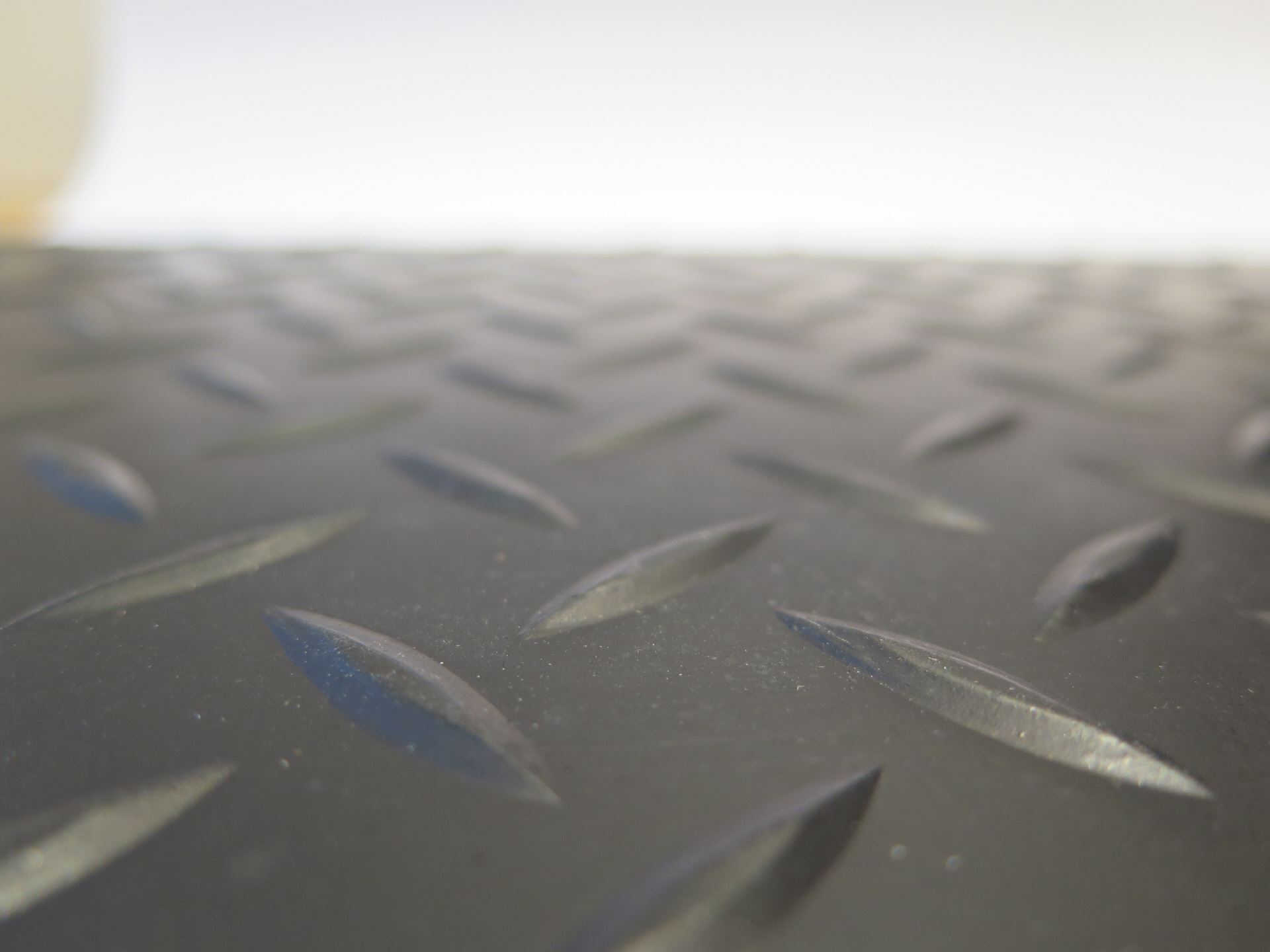 Hier sehen Sie Detailbilder der schwarzen Riffelblechmatte vom Gummishop24: - Forderseite mit Riffelblechmuster - Rautenprofil im Detail - Rückseite